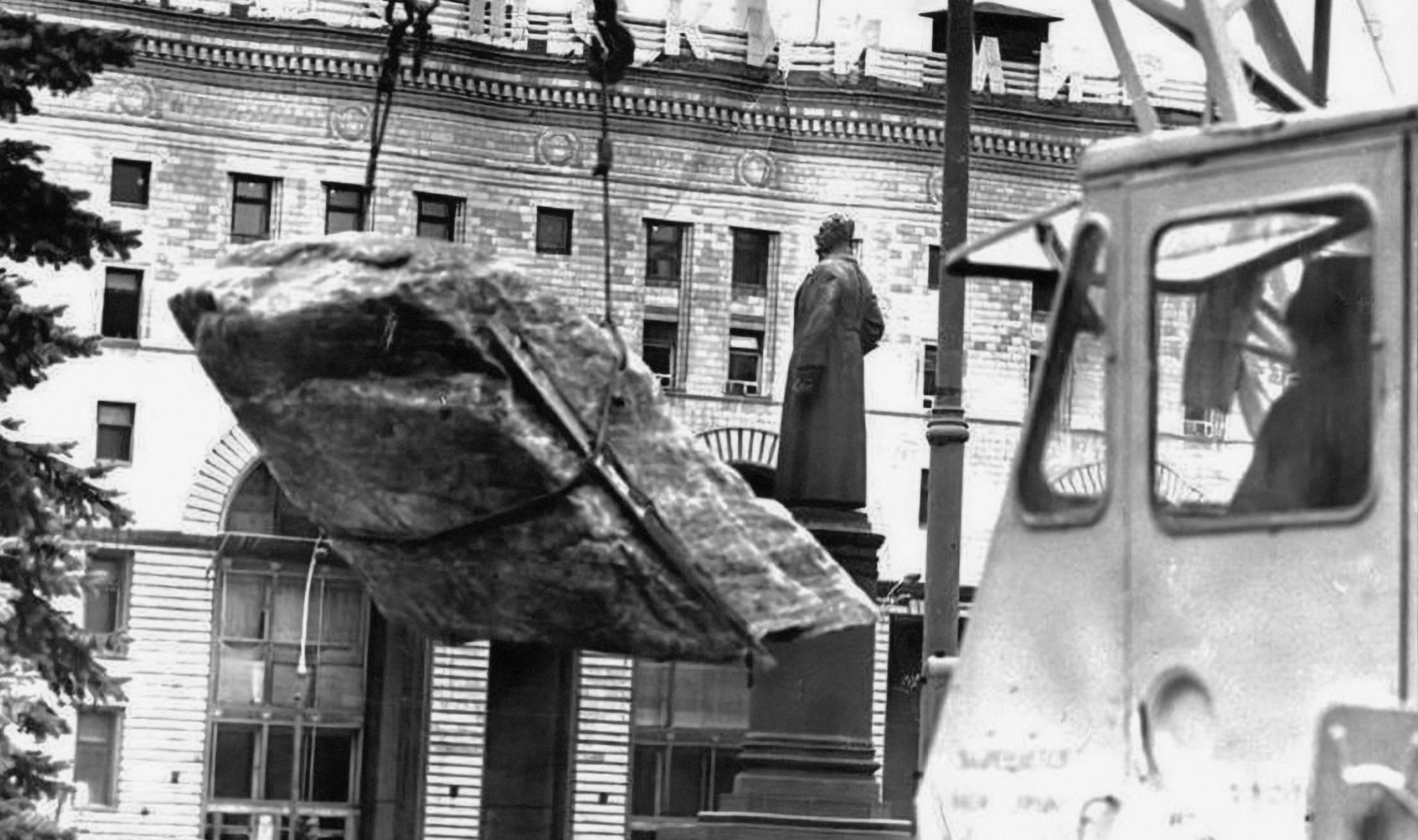 Vor der Lubjanka, dem Sitz des sowjetischen Geheimdienstes, wird als Denkmal für die Opfer der politischen Repressionen am 30. Oktober 1990 ein Stein von den Solowezki-Inseln aufgestellt. Dort hatte das kommunistische Regime ab 1923 die ersten Lager errichtet. Foto: Sammlung Memorial