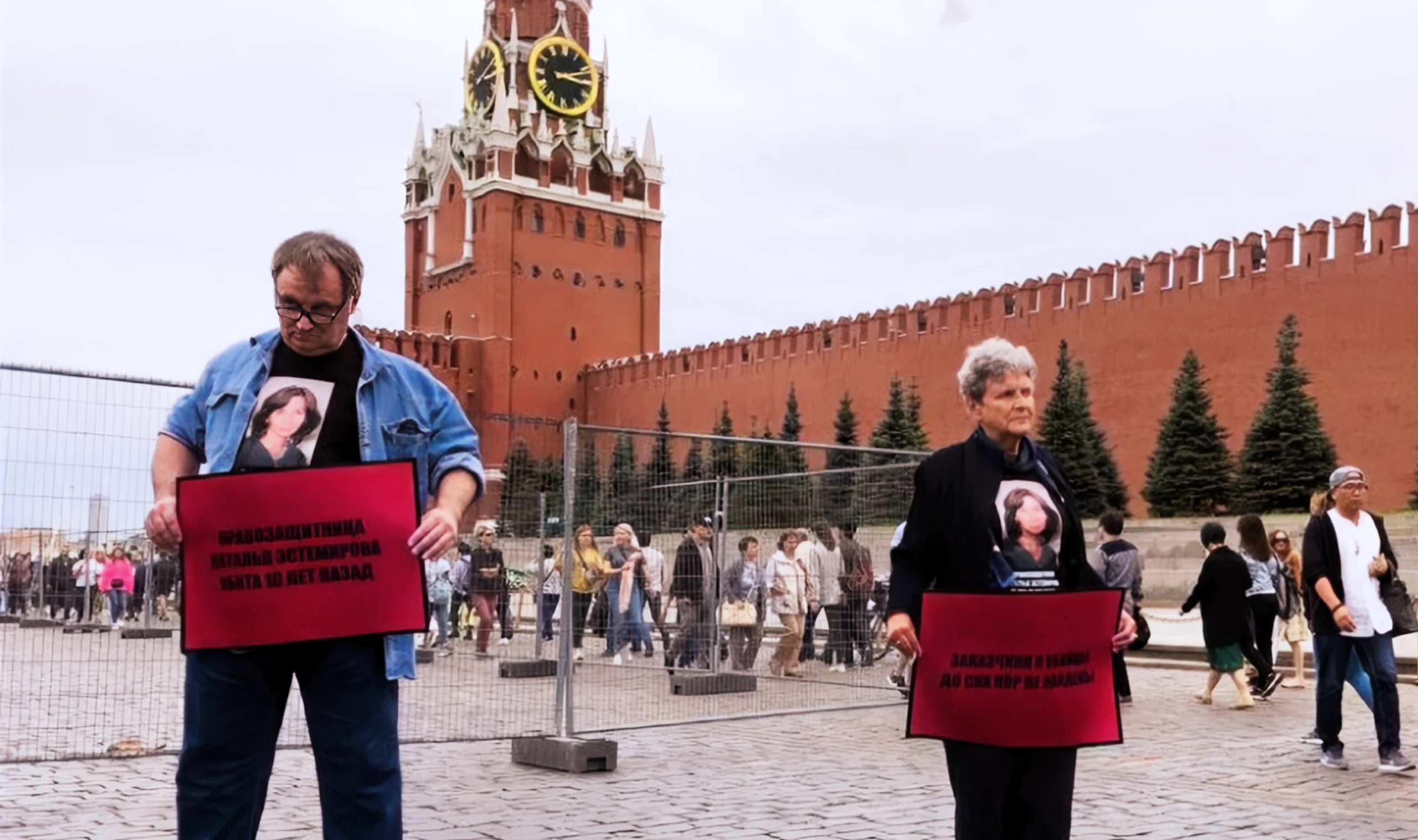 Swetlana Gannuschkina und Alexander Tscherkassow von Memorial halten am 31. Juli 2017 eine Mahnwache auf dem Roten Platz in Moskau ab. Sie fordern die Untersuchung des Mordes an Natalja Estemirowa. Foto: Sammlung Memorial