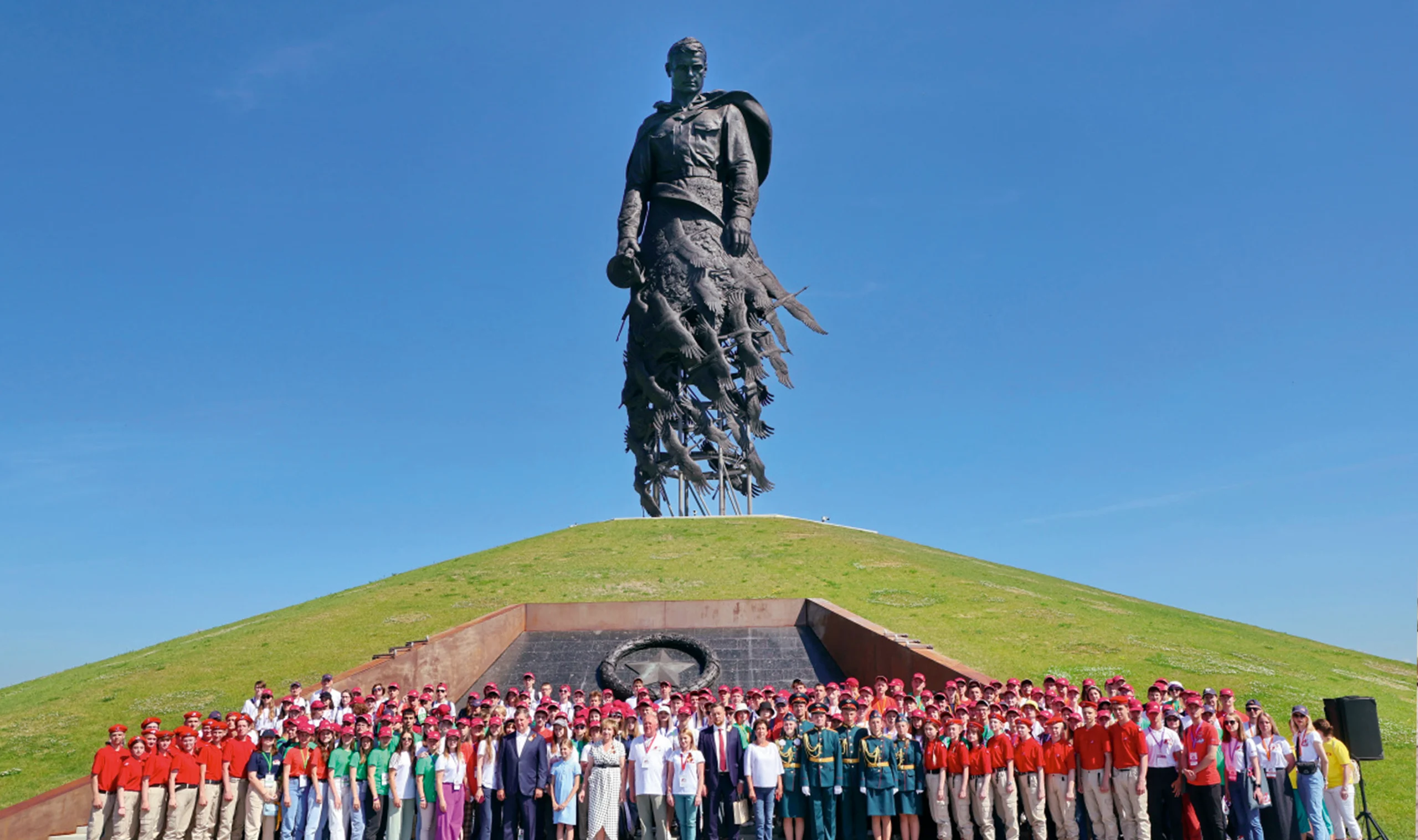 Am 30. Juni 2020 von Putin eingeweihtes monumentales Denkmal „Für den sowjetischen Soldaten“ in der Nähe der Stadt Rschew. Die Figur eines 25 Meter hohen Sowjetsoldaten auf einem 10 Meter hohen Grabhügel erinnert an die Schlacht bei Rschew. Von Ende 1941 bis März 1943 kamen hier bis zu 2 Millionen Soldaten der Roten Armee um. Sie waren schlecht ausgerüstet und organisiert. Trotz enormer Verluste von bis zu 90% mussten sie auf Befehl Stalins immer wieder gegen die deutschen Besatzer anrennen, ohne einen Sieg erringen zu können. In der Sowjetunion wurde die Schlacht deshalb tabuisiert, von Putin hingegen zu einem Ereignis vorbildhafter patriotischer Treue und heroischer Aufopferung umgedeutet. Formsprachlich bezieht sich das Denkmal offen auf den Sozialistischen Realismus. Inhaltlich und ästhetisch ruft es zur Identifikation mit der Sowjetunion auf und deklariert die angebliche unbedingte Gefolgschaft und patriotische Aufopferung von damals zur Leitlinie für heute. Foto: Pressedienst des Föderationsrates der Föderalen Versammlung der Russischen Föderation