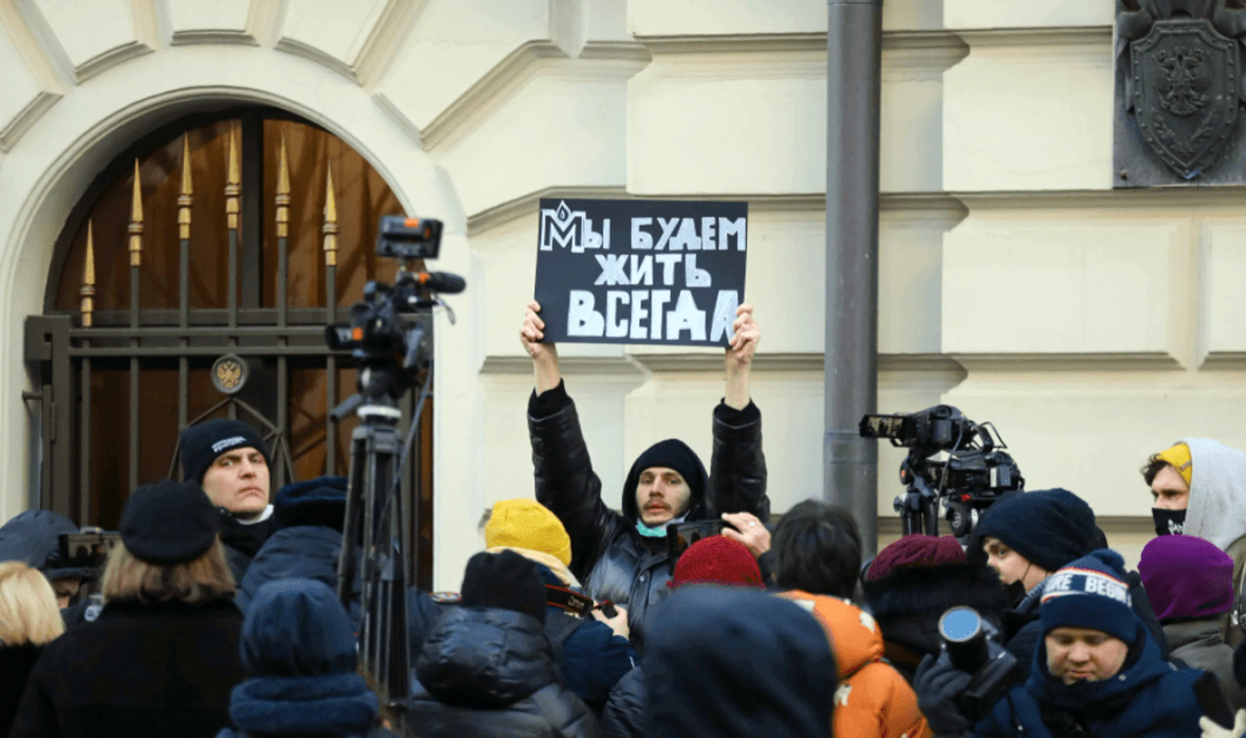Mahnwache im Dezember 2021 vor dem Obersten Gericht der Russischen Föderation in Moskau zur Unterstützung für Memorial. Auf dem Schild ist das Logo von Memorial zu sehen und der Satz: „Wir werden immer leben“. Foto: Natalia Kolesnikova, AFP