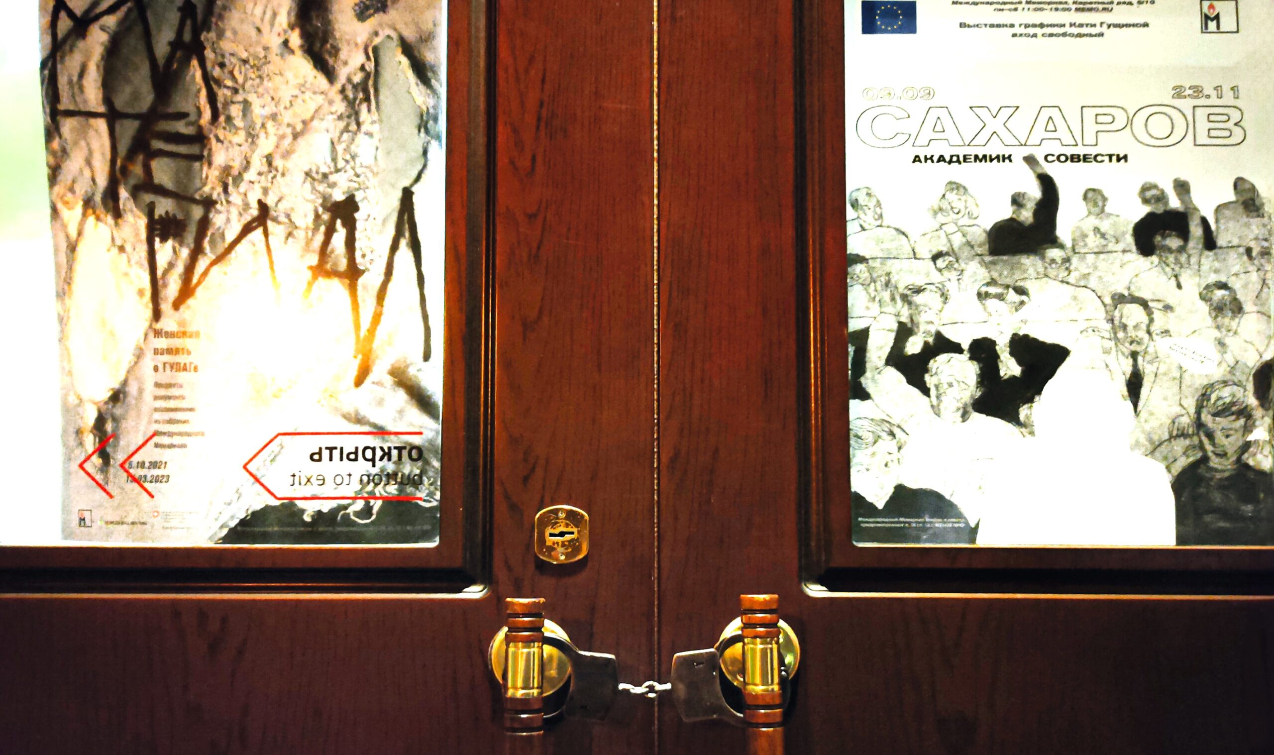 Polizisten verriegeln am 14. Oktober 2021 den Eingang zum Gebäude von Memorial in Moskau mit Handschellen. Foto: Darja Krotowa, Sammlung Memorial