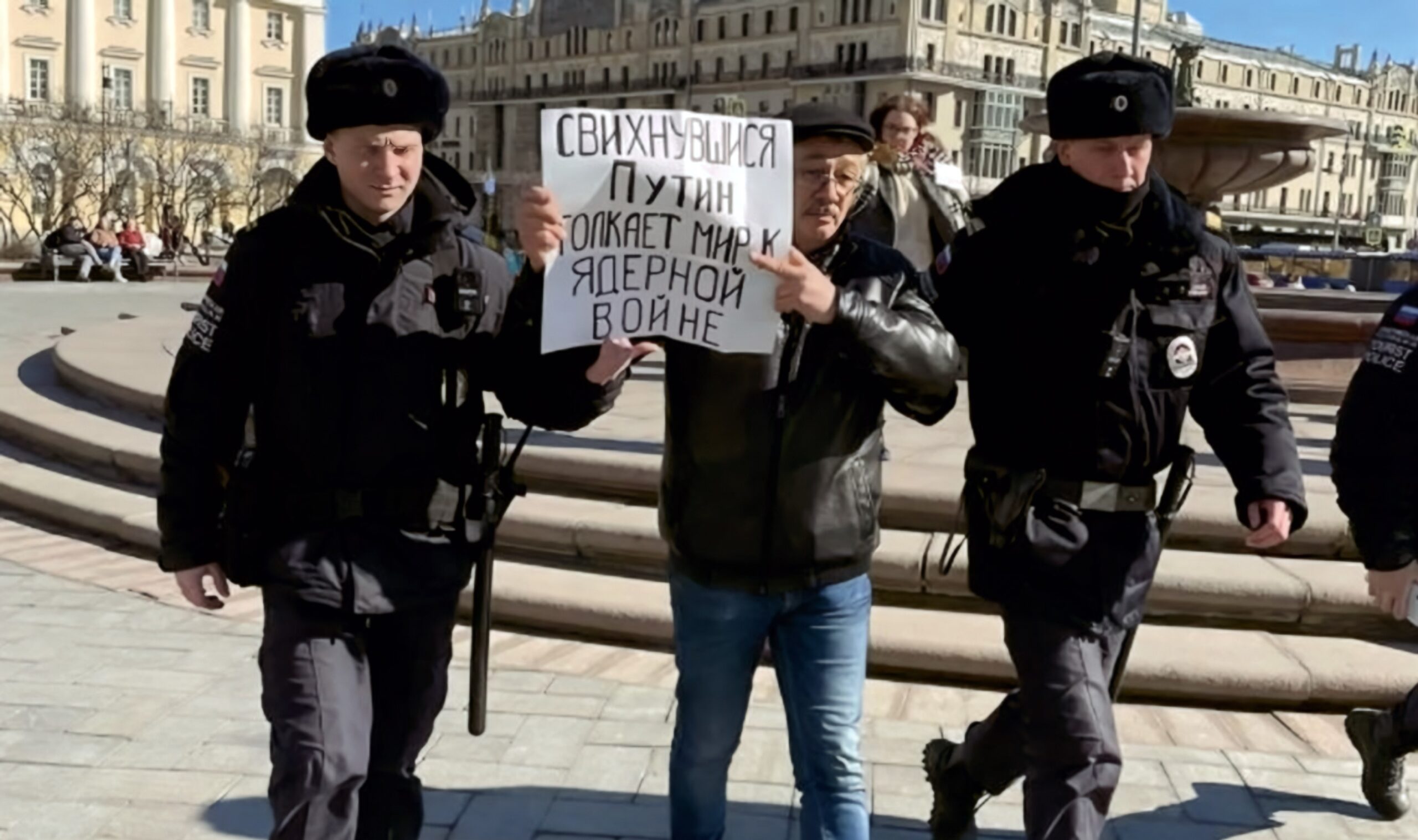 Am 20. März 2022 wird Oleg Orlow, Menschenrechtler und Mitbegründer von Memorial, wegen seiner Mahnwache gegen den russischen Überfall auf die Ukraine auf dem Teatralnaja-Platz in Moskau verhaftet. Auf seinem Plakat steht: „Der verrückte Putin treibt die Welt in den Atomkrieg“. Foto: Anastassija Jegorowa, Nowaja Gaseta
